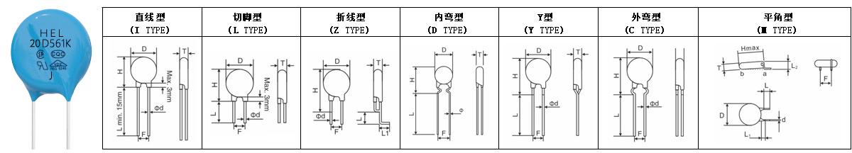 | 型號(hào)規(guī)格 | 壓敏電壓 | 最大允許使用電壓 | 最大限制電壓 | 通流容量 | 電極種類 | 包裝方式 | 產(chǎn)品外形 | 是否 切短腳 |