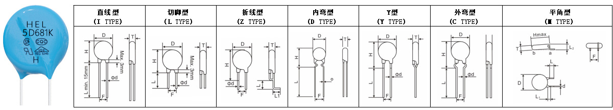 | 型號規(guī)格 | 壓敏電壓 | 最大允許使用電壓 | 最大限制電壓 | 通流容量 | 電極種類 | 包裝方式 | 產(chǎn)品外形 | 是否 切短腳 |